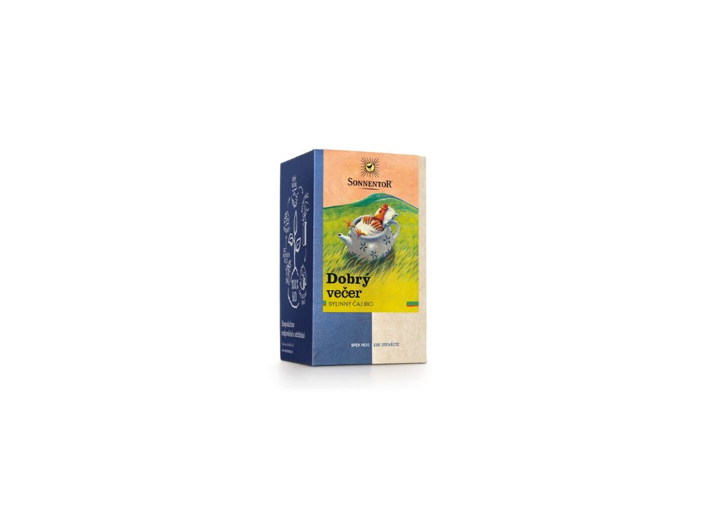 Čaj Dobrý večer porcovaný dvoukomorový 27 g Sonnentor. Abyste si odpočinuli od ruchu všedního dne a strávili klidnou noc, najděte si večer chvilku pro sebe a vychutnejte si šálek tohoto čaje.