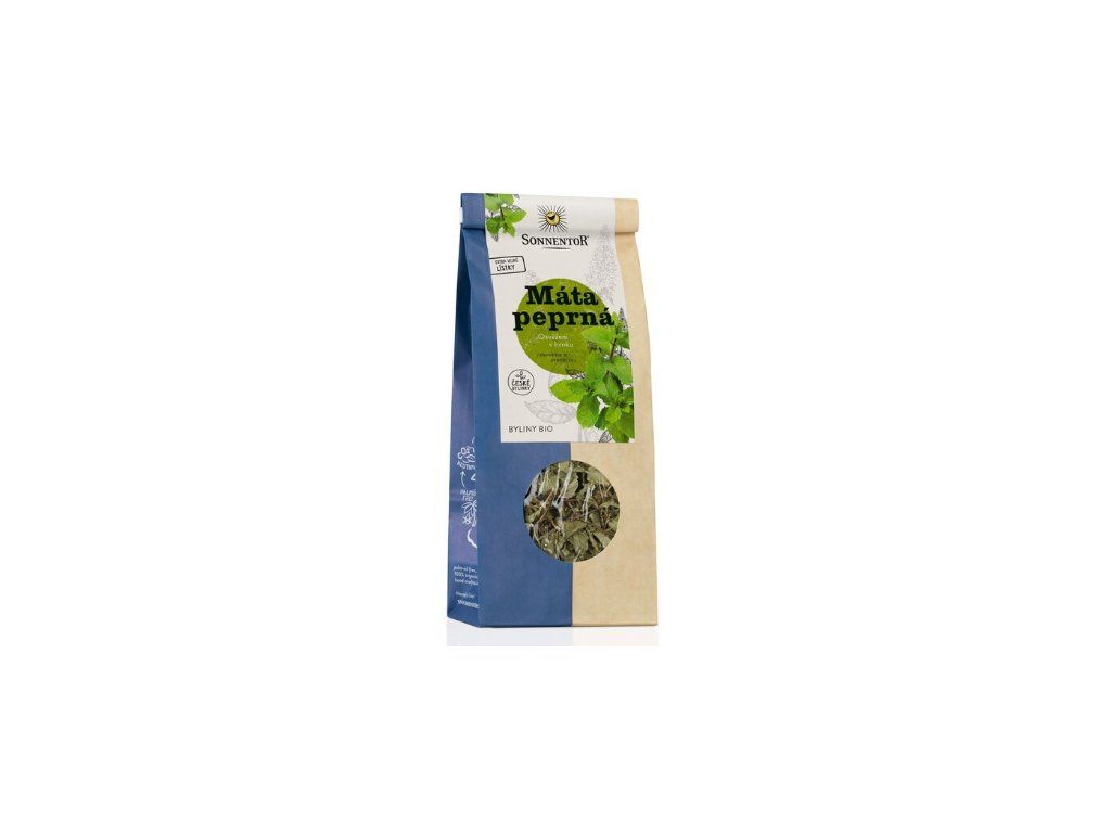 Čaj Máta peprná sypaná Sonnentor 50 g. Tato chladivá rostlina je bylinou pro „horké hlavy“ a je velmi oblíbená v teplých zemích, jako je Maroko.