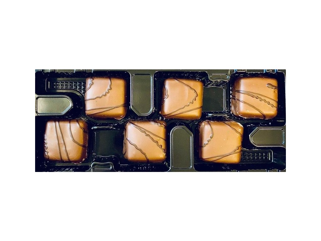 SLOŽENÍ: mléčná čokoláda 31,6% (cukr, kakaové máslo, sušené plnotučné mléko, kakaová hmota, laktóza (mléko), emulgátor: sójový lecitin) pšeničná mouka, mléčná náplň (rostlinné tuky (palmový, slunečnicový, rafinovaný) cukr, odtučněné mléko, laktóza (mléko), kakaový prášek se sníženým obsahem tuku, emulgátor: sójový lecitin), Guérande solený karamel 10% (glukózový sirup, cukr, rostlinné tuky (palmový, palmojádrový), máslo (mléko), voda, tekutá smetana (tuk: 31%) (mléko), sůl Guérande (1,25%), emulgátor: sójový lecitin), cukr, rostlinné tuky (palmový, kopra), hořká čokoláda 4,1% (cukr, kakaová hmota, kakaové máslo, odvodněný mléčný tuk, emulgátor: sójový lecitin, přírodní vanilková příchuť), dextróza, vejce z volného chovu, sirup z glukózového cukru, sójová mouka, řepkový olej, sůl, kypřící činidlo (uhličitany sodné), přírodní aroma. Tmavá čokoláda: kakaová sušina minimálně 46%. Mléčná čokoláda: kakaová sušina minimálně 31%. Může obsahovat stopy ořechů (mandle, lískové ořechy).