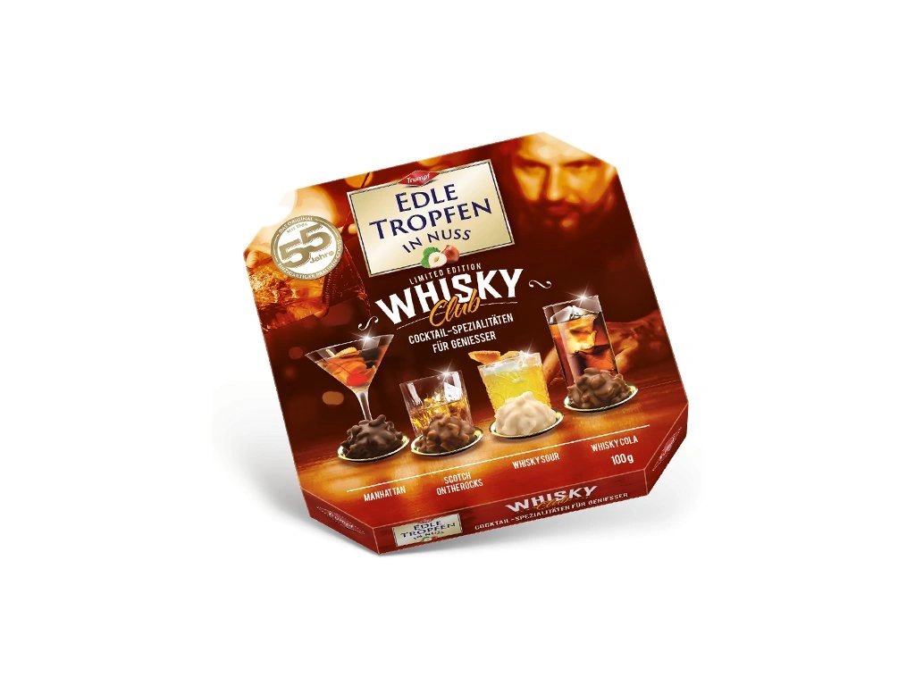 Bar Noble Drops in Nuts se plní! Vedle ginu, vodky a rumu je nová módní edice Whisky Club Edition dokonalým doplňkem sortimentu lihovin. Čtyři čokolády se svůdně složenými koktejlovými specialitami jistě potěší skutečné milovníky whisky: Manhatten, Scotch on the rocks, Whisky Sour a Whisky Cola! Prostě neodolatelné!