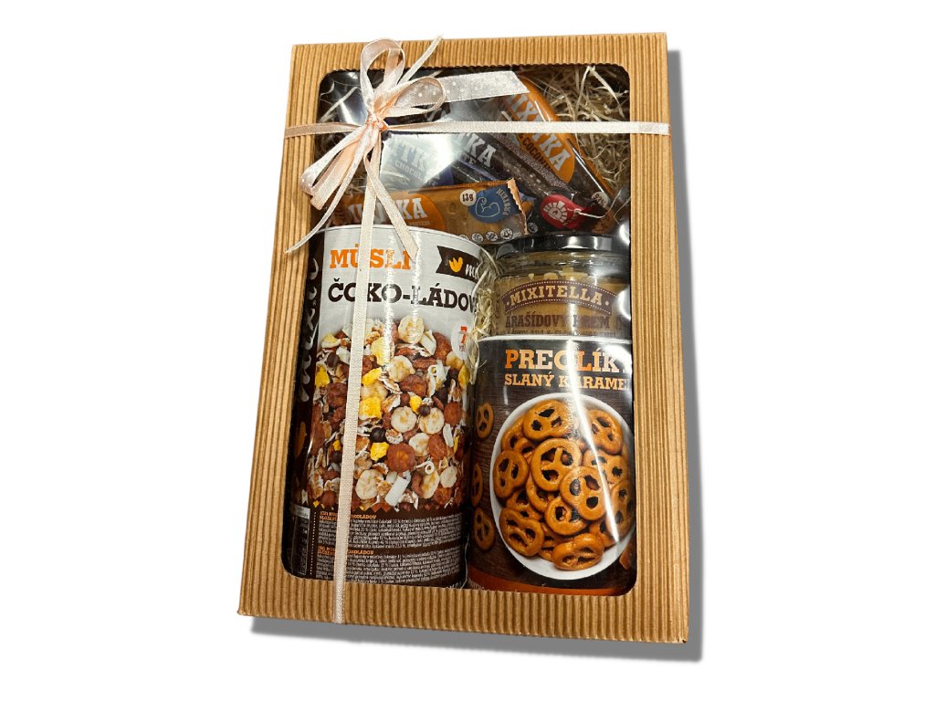 Dárkový balíček obsahující produkty pro milovníky čokoládového mlsání.