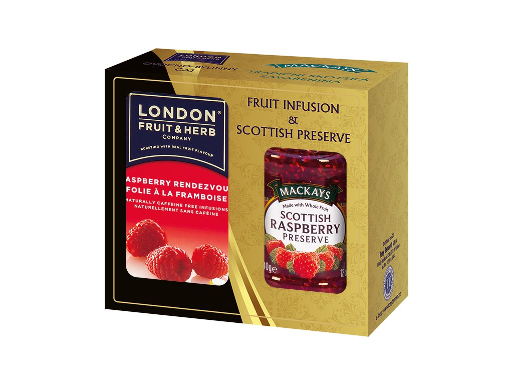 Sada obsahuje malinový čaj London fruit and herb + malinový džem Mackays.
