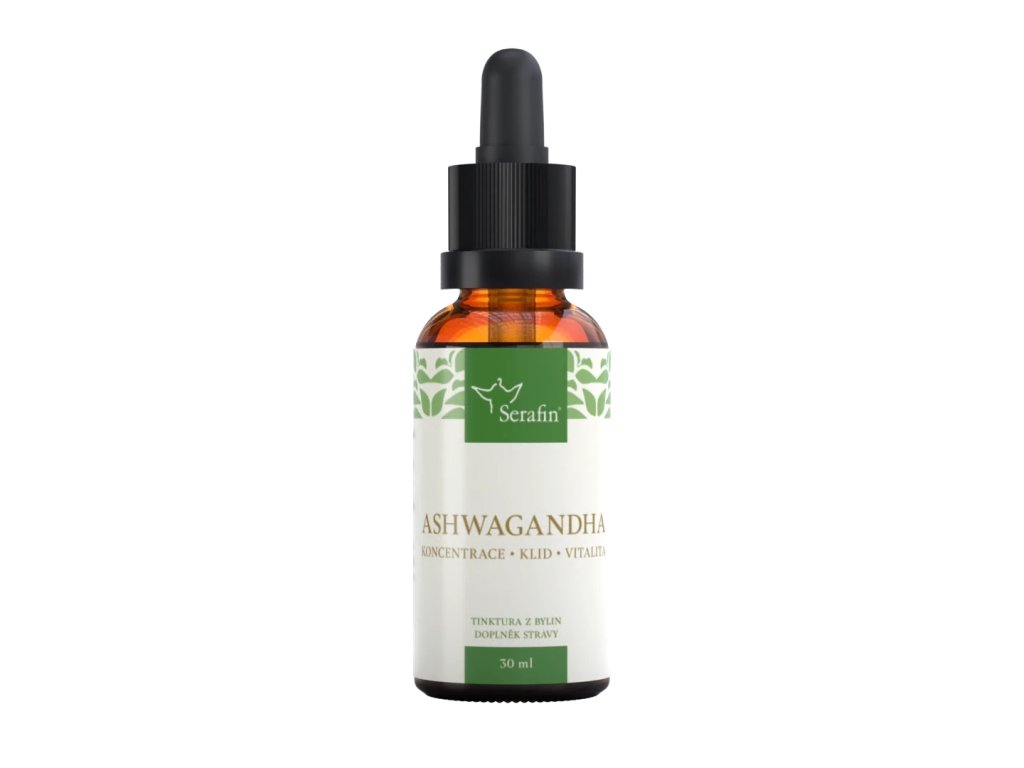 Ashwagandha 30 ml tinktura Serafin. Speciální tinktura z kořene byliny zvané ashwagandha neboli vitánie snodárná (Withania somnifera). Působí zejména na klid, vitalitu a koncentraci.