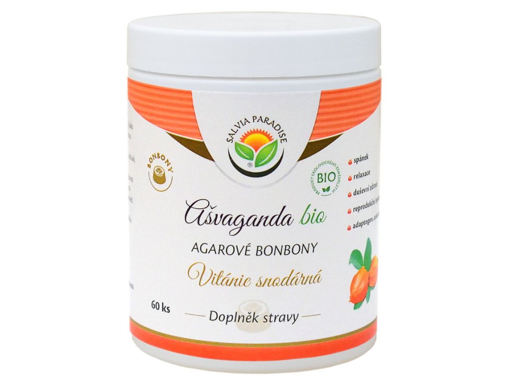 Salvia Paradise Ašvaganda vitánie agarové bonbony BIO 60 ks. Měkké agarové bonbony Salvia Paradise® – inovativní doplněk stravy s vysokým podílem bylinných extraktů. Díky měkké konzistenci a přesnému dávkování jsou ideální pro mladistvé i seniory, kterým nevyhovují klasické tuhé bonbony.