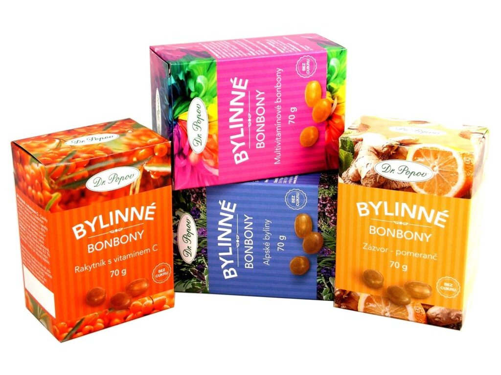 Bylinné bonbony Dr. Popova – mají sníženou kalorickou hodnotu o 40 % (oproti bonbonům s obsahem cukru).