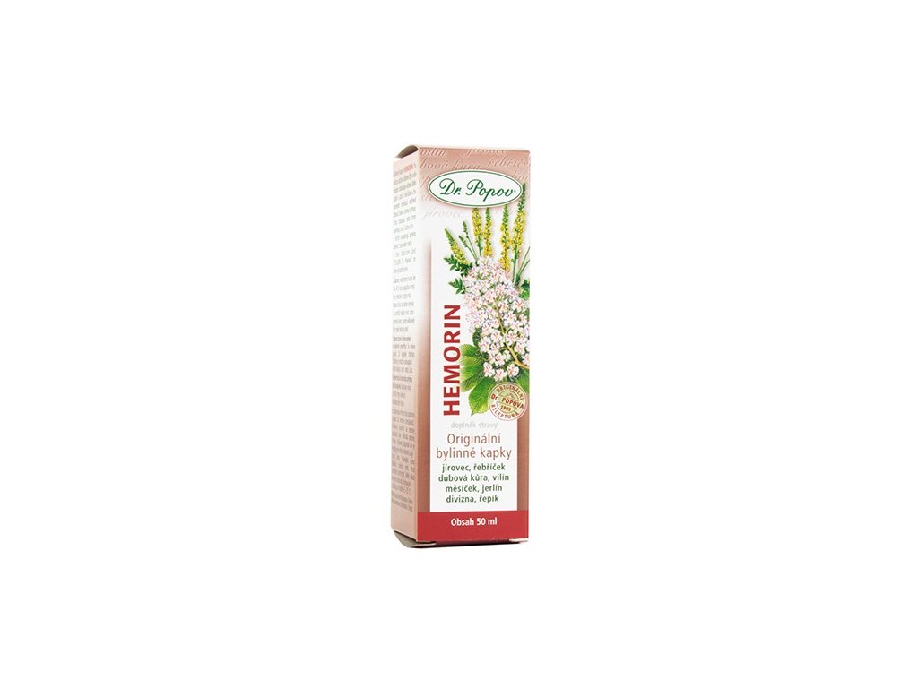 Naše bylinné kapky představují diskrétní a účinnou cestu, jak se vrátit k pohodlí. Originální bylinné kapky Dr. Popova Hemorin díky unikátnímu složení z pečlivě vybraných bylin, které působí synergicky, vám pomohou udržet zdravou činnost cévní soustavy. Kapky posilují žilní a cévní stěny (jírovec maďal) a zlepšují krevní oběh v postižené oblasti, čímž řeší příčinu problému, nikoli jen jeho symptomy. Za zmínku rozhodně stojí jerlín vynikající zdroj rutinu, jírovec, který udržuje zdravé žíly a vlásečnice (obsahuje účinnou látku escin). Anebo dubová kůra, která společně s měsíčkem podpoří správnou činnost trávicího traktu a střev a má skvělé stahující a uklidňující účinky. Pomáhají udržovat zdraví dolních končetin a konečníku. Podporují cirkulaci a pomáhají zklidnit citlivé partie.