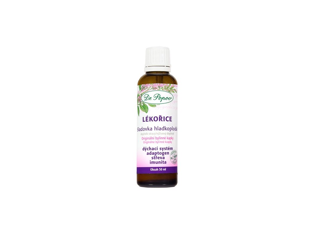 Lékořice, originální bylinné kapky, 50 ml Dr. Popov. Přírodní balzám na dýchací cesty a hrdlo, harmonizuje trávení a nervový systém. Doplněk stravy.