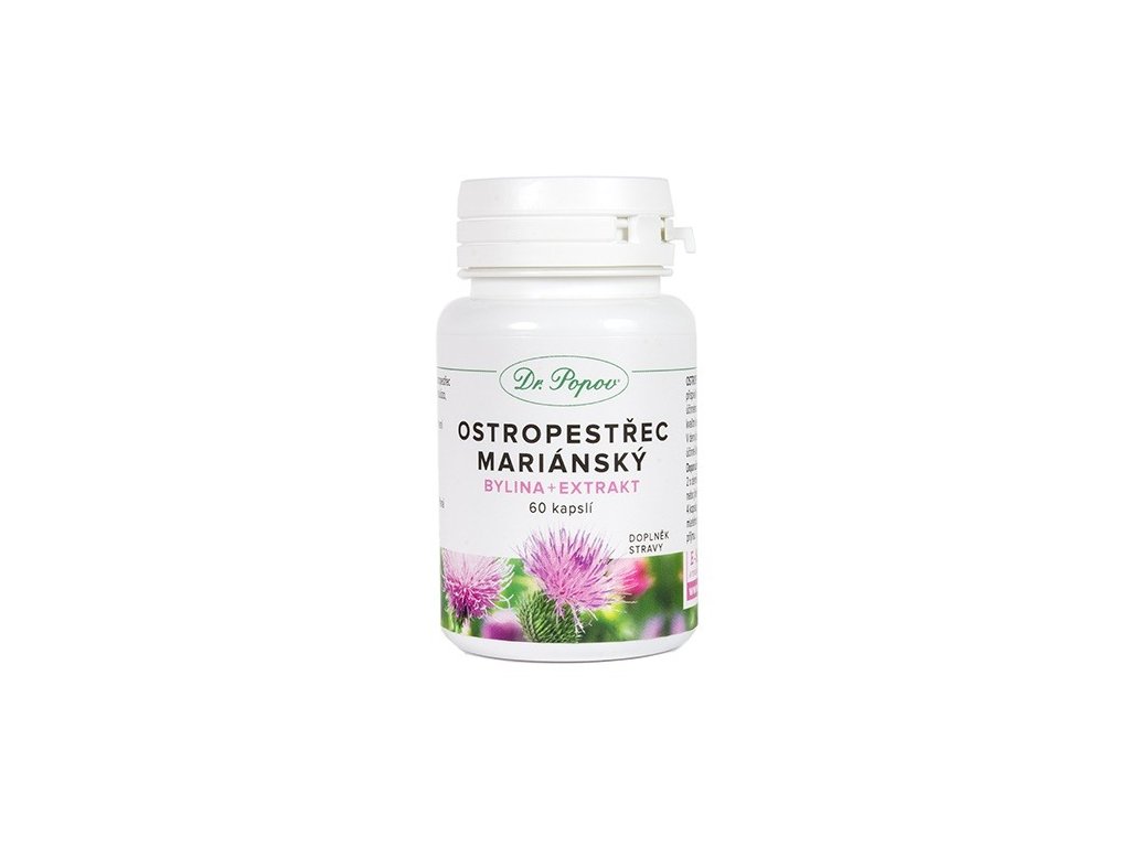 Ostropestřec mariánský , 60 kapslí Dr. Popov. Pro zdravé fungování jater a jejich detoxikaci, dvojí účinek (tradiční bylina a její extrakt).