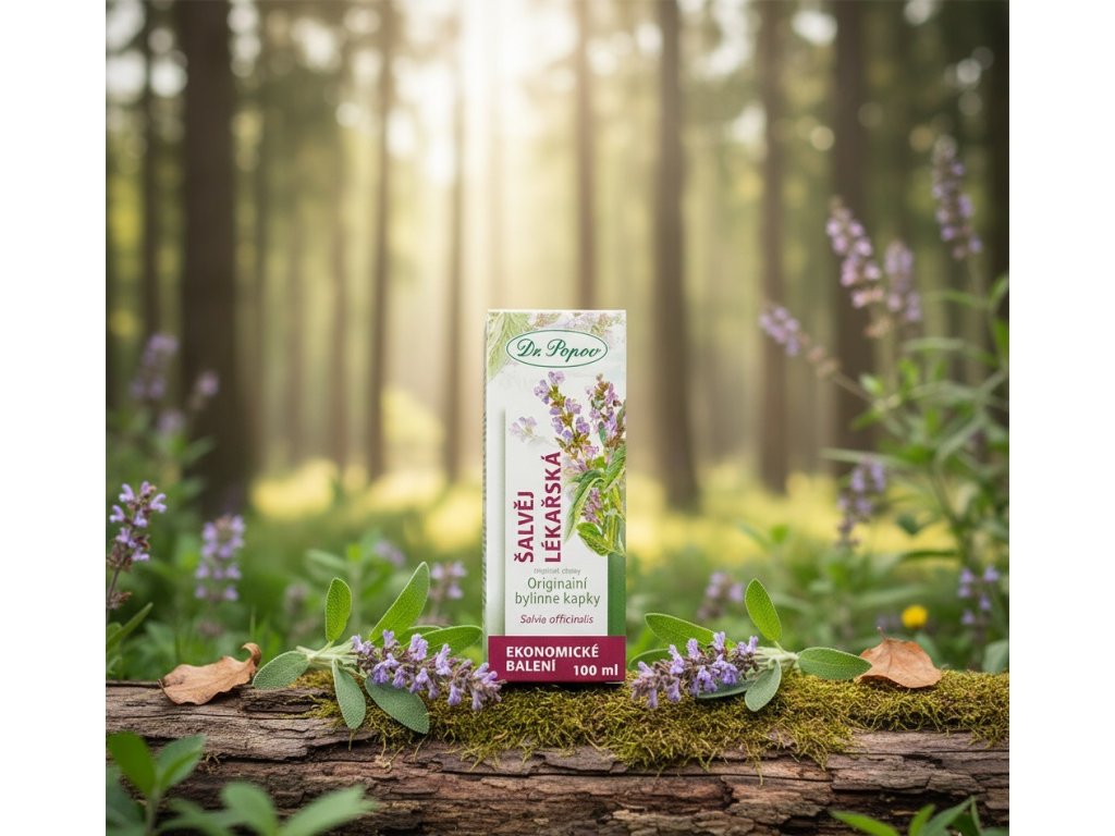 Šalvěj lékařská, originální bylinné kapky, 100 ml Dr. Popov. Pocit pohody a hormonální rovnováha v období klimakteria i před menstruací. Při pocení. Doplněk stravy.