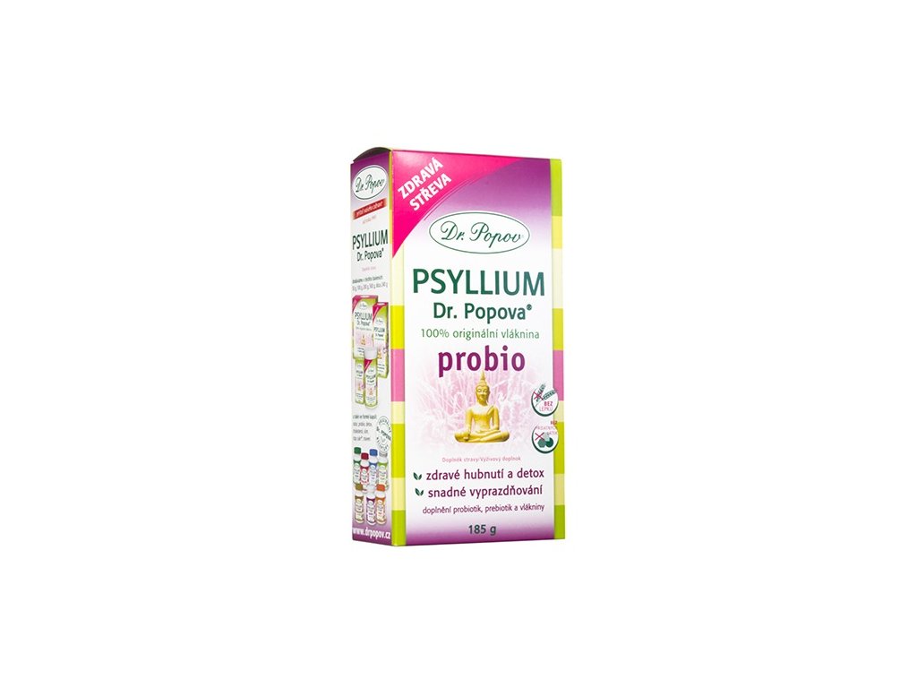 Vláknina Psyllium PROBIO 185 g Dr. Popov. Směs vysoce kvalitní vlákniny a probiotických kvasinek pro dobré trávení a zdravou střevní mikroflóru.
