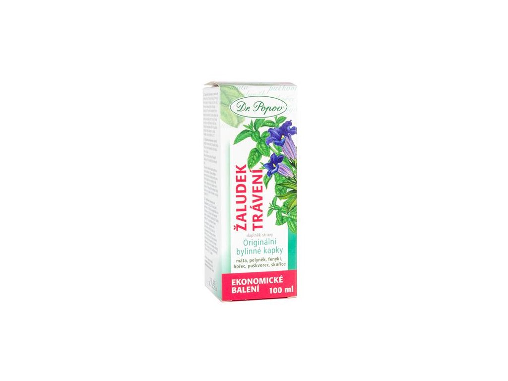 Žaludek - trávení, originální bylinné kapky, 100 ml Dr. Popov. Pomozte trávení, ať nemáte trápení. Obsažené hořčiny účinkují rychle. Doplněk stravy