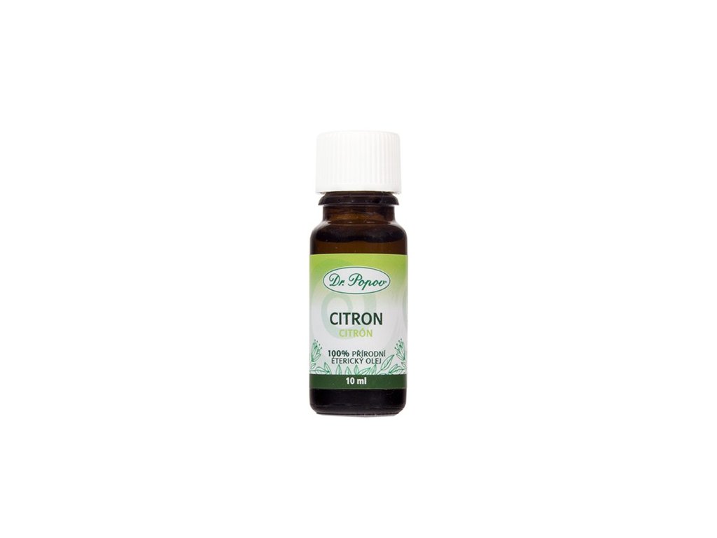 Citronová silice, 10 ml Dr. Popov. Má osvěžující účinky (po duševní námaze). Působí při bolestech hlavy, pomáhá při infekci dýchacích cest. Snižuje krevní tlak. V koupeli působí příznivě na pleť.