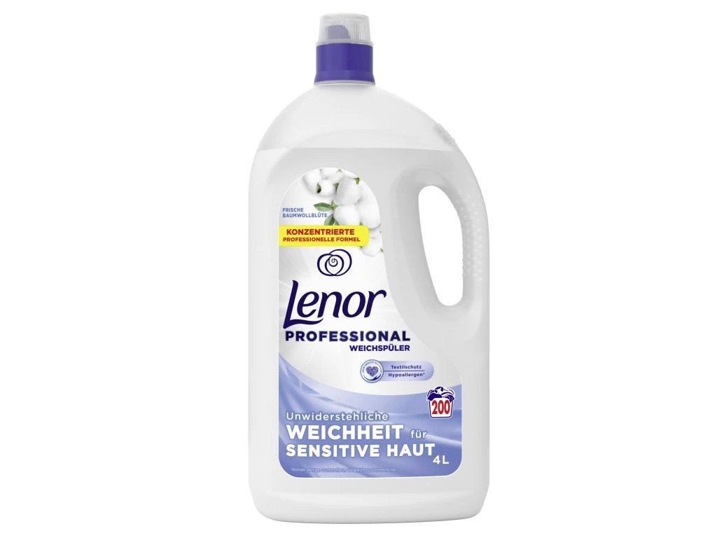 Lenor Professional Aviváž Sensitiv 200 pracích dávek 4l. Profesionální aviváž Lenor osvěží vaše prádlo, změkčí ho a ochrání vlákna díky vysoce koncentrovanému složení vyvinutému speciálně pro profesionální použití. Se svěží vůní levandule.