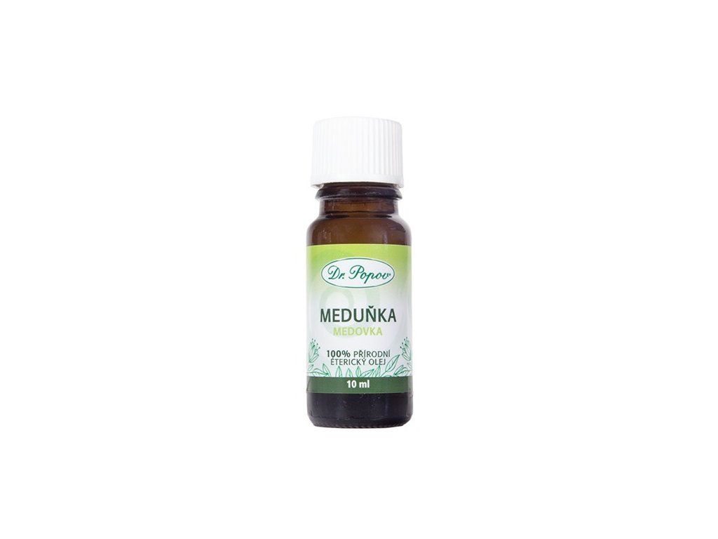 Meduňková silice, 10 ml Dr. Popov. Snižuje psychické napětí. Vhodná při nespavosti. Povzbuzuje srdeční činnost a snižuje krevní tlak. V koupeli má relaxační účinky.