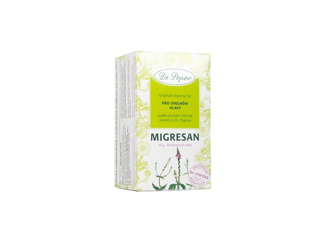 Dopřejte své hlavě klid a odpočinek. Bylinný čaj Dr. Popova Migresan obsahuje tradičně užívané byliny s relaxačními, zklidňujícími a uvolňujícími účinky, které jsou vhodné při trápení s hlavou, nepříjemných pocitech v oblasti hlavy anebo při starostech. Meduňka, třezalka i levandule přispívají ke zklidnění, emoční a hormonální rovnováze, také napomáhají kvalitnímu spánku. Nalezněte přírodní cestu k relaxaci a pohodě.