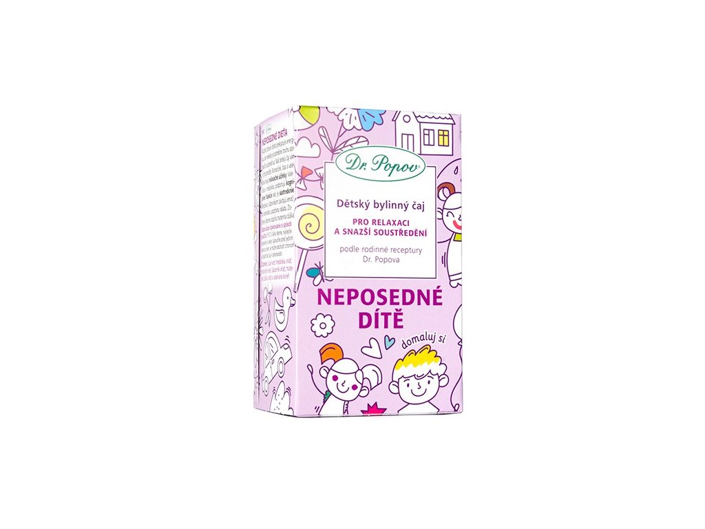 Neposedné dítě, dětský bylinný čaj, 30 g Dr. Popov. Dětský čaj pro relaxaci a snazší soustředění (krabička pro děti na dokreslení).