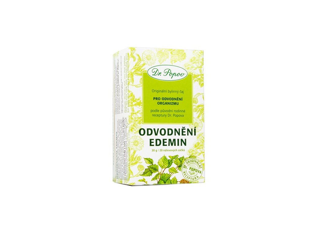 Zadržování vody v těle způsobuje nepříjemné otoky. Může mít různé příčiny: špatné stravování s nadbytkem soli, alkoholu, cukru, uzenin nebo konzervovaných a instantních potravin. Na vině mohou být i některé léky anebo také nedostatek pohybu. Bylinný čaj Odvodnění Edemin Dr. Popova obsahuje směs z 10 prověřených bylin. Důležitou použitou bylinou je kopřiva, která společně s břízou podporuje vylučování vody z organizmu, podílí se na zdravé činnosti ledvin a celkově osvěžuje tělo. Další obsažené byliny (bříza, vřes a řepík) přispívají ke správnému fungování ledvin a močových cest.