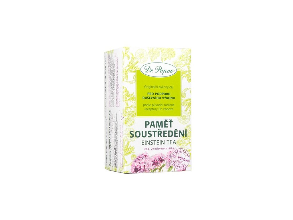 Bylinný čaj Dr. Popova Paměť soustředění, Einstein tea podporuje duševní výkonnost díky obsaženému dobromyslu, mozkové funkce (zejména paměť a soustředění) a dodává pocit psychické pohody (díky meduňce, mátě a heřmánku). Osvěžující chuť vám pomůže nastartovat den nebo se znovu soustředit, když cítíte únavu. Čaj je vhodný pro studenty, manažery i seniory. Pro lepší učení, práci i každodenní život.