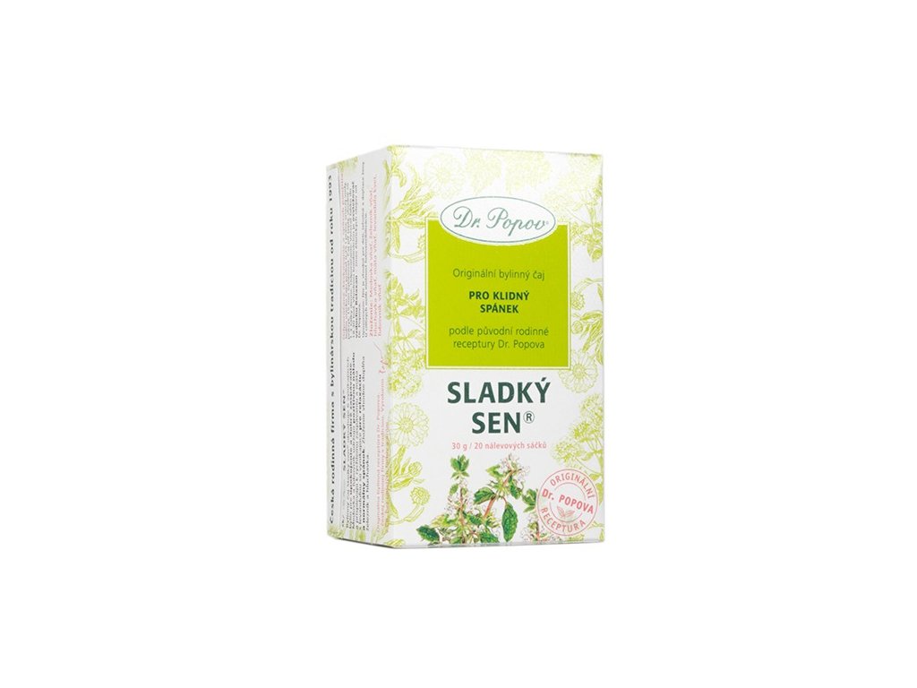 Máte potíže usnout nebo se v noci často budíte? Dopřejte si klidný spánek s naším čajem. Pomůže vám uvolnit se po náročném dni a připravit tělo i mysl na spánek. Bylinný čaj Dr. Popova Sladký sen® v sobě spojuje sílu tradičně užívaných relaxačních bylin. Obsahuje 6 vynikajících bylin pro zklidnění a dobré usínání. Meduňka a třezalka jsou známé svými účinky na dobrou náladu, psychickou vyrovnanost a napomáhají snadnějšímu usínání. Levandule s mátou podporují zdravý spánek a relaxaci. Složení vhodně doplňuje sporýš a hluchavka.