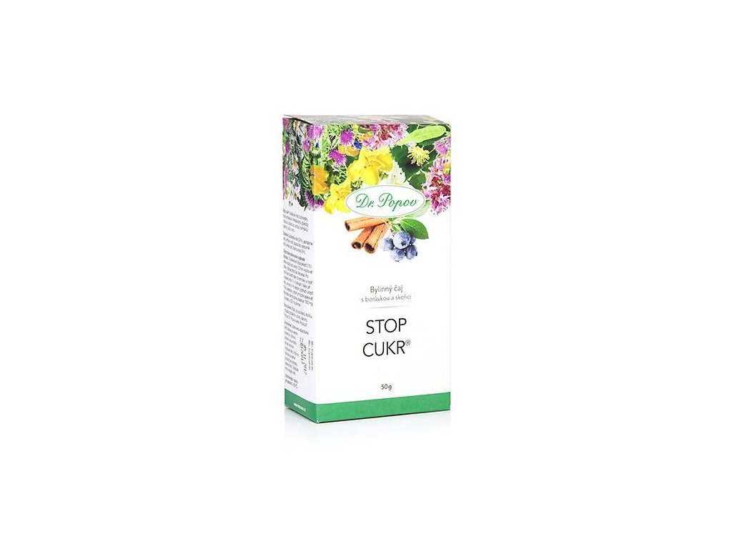 Bylinný čaj Dr. Popova Stop cukr® obsahuje nať borůvky, která přispívá k metabolizmu glukózy a spolu se skořicí udržují normální hladinu cukru v krvi. Čaj dále obsahuje jestřabinu, kopřivu, pampelišku, srdečník a fenykl.