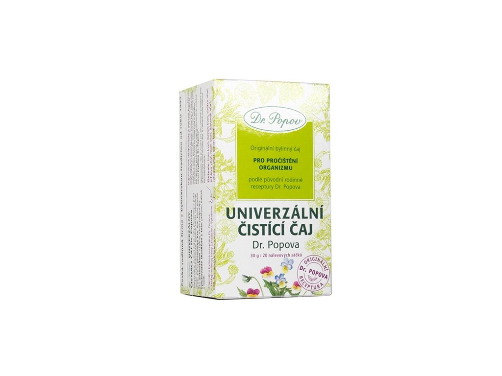Univerzální čistící čaj Dr. Popova obsahuje byliny vhodné pro čištění organizmu. Kopřiva čistí krev, podporuje správnou činnost ledvin a stimuluje činnost slinivky, lípa je známá pro své antioxidační vlastnosti a společně s maceškou se také podílejí na čištění krve. Pro vyšší účinek jsme do čaje použili ještě ibišek, řepík, třezalku, řebříček a oman.
