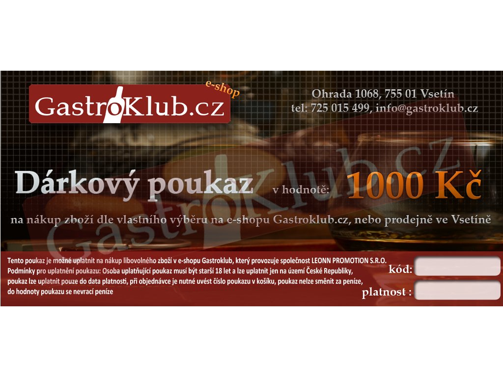 Dárkový poukaz 1000 Kč. Vánoční čas se kvapem blíží, a proto jsme připravili speciální nabídku dárkových poukazů na nákup jakéhokoliv zboží z našeho e-shopu. Nevíte, který nápoj by nejvíce ocenil Váš protějšek, kamarád či známý? Nechejte výběr na nich. Jejich radost bude o to větší. Po zadání objednávky, již vše zařizujeme za vás. Poukaz zasíláme ve formě e-mailu na Vámi zadaný mail. Platnost poukazu je půl roku od zakoupení, každý má svůj vlastní kód a lze jej použít pouze k jednorázovému nákupu. Při nákupu za vyšší hodnotu doplatí obdarovaný pouze rozdíl v ceně. Při objednávce za nižší hodnotu než má poukaz z technických důvodů peníze zpět nevracíme. Dárkový poukaz lze využít pouze k nákupu v e-shopu www.GastroKlub.cz nebo v naší pobočce ve Vsetíně a lze použít jen jednorázově. Poukazy neproplácíme.