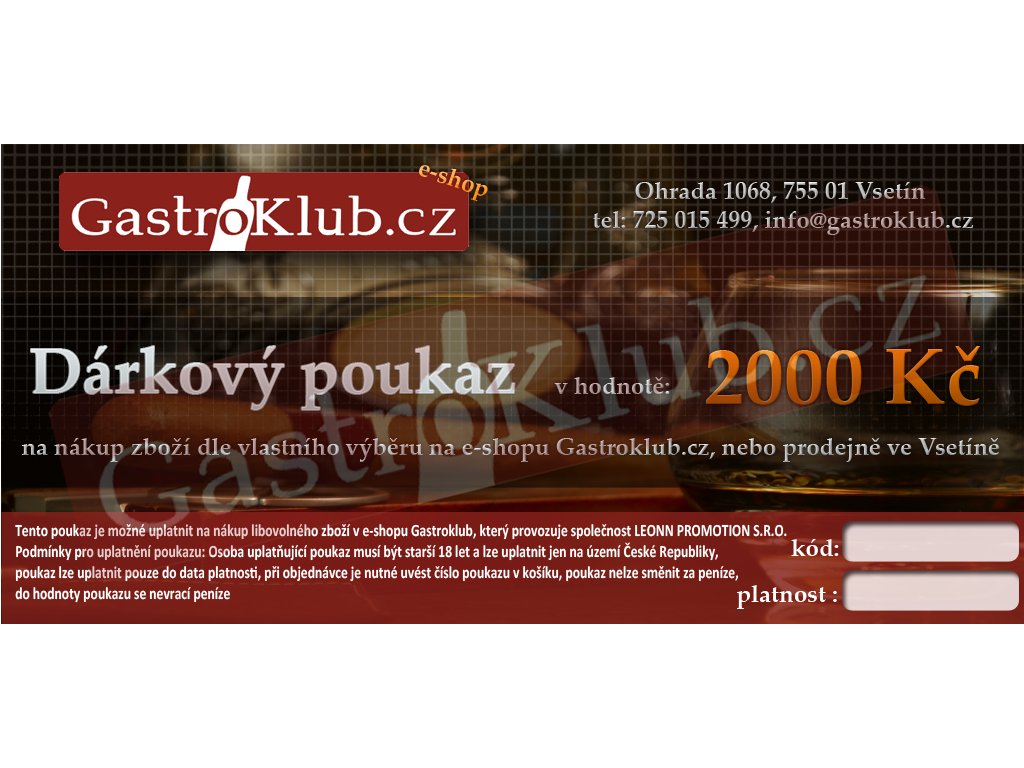 Dárkový poukaz 2000 Kč. Vánoční čas se kvapem blíží, a proto jsme připravili speciální nabídku dárkových poukazů na nákup jakéhokoliv zboží z našeho e-shopu. Nevíte, který nápoj by nejvíce ocenil Váš protějšek, kamarád či známý? Nechejte výběr na nich. Jejich radost bude o to větší. Po zadání objednávky, již vše zařizujeme za vás. Poukaz zasíláme ve formě e-mailu na Vámi zadaný mail. Platnost poukazu je půl roku od zakoupení, každý má svůj vlastní kód a lze jej použít pouze k jednorázovému nákupu. Při nákupu za vyšší hodnotu doplatí obdarovaný pouze rozdíl v ceně. Při objednávce za nižší hodnotu než má poukaz z technických důvodů peníze zpět nevracíme. Dárkový poukaz lze využít pouze k nákupu v e-shopu www.GastroKlub.cz nebo v naší pobočce ve Vsetíně a lze použít jen jednorázově. Poukazy neproplácíme.