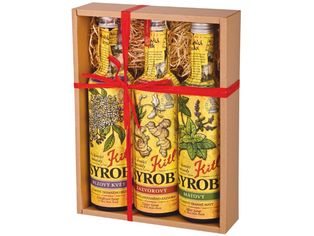 Syrob Bylinky 3x0,5l Dárkové balení Kitl. Dárkové balení Bylinných sirupů Kitl. Obsahuje 3x 500 ml – Kitl Syrob Bezový, Kitl Syrob Zázvorový a Kitl Syrob Mátový.