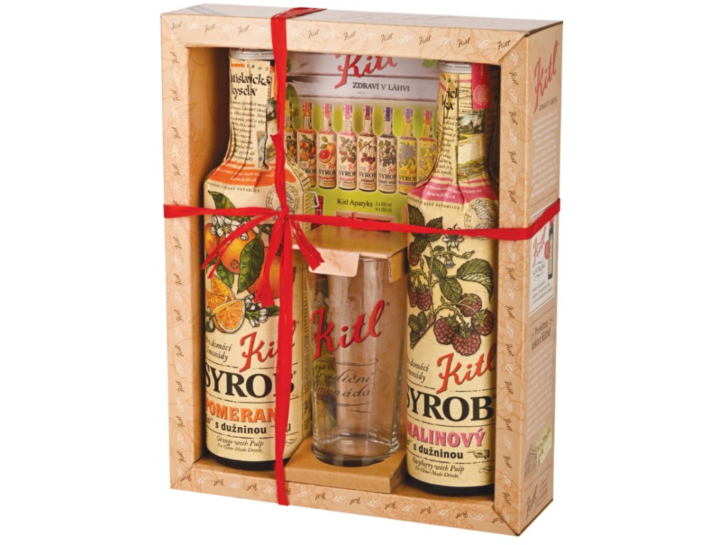 Syrob Pomeranč a Malina 2x0,5l Kazeta se skleničkou. Dárková kazeta se sirupy Kitl, která obsahuje oblíbený Kitl Syrob Malinový (500 ml) a lahodný Kitl Syrob Pomeranč s dužninou (500 ml) spolu s originální Kitl skleničkou na 200 ml nápoje navíc.