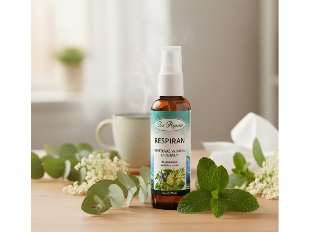 Aktivní osvěžovač vzduchu Respiran Dr. Popova obsahuje ojedinělou kombinaci esenciálních olejů, které příznivě působí při dýchacích potížích a rýmě: mátu, eukalyptus, levanduli a Tea Tree Oil.