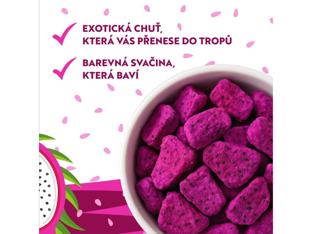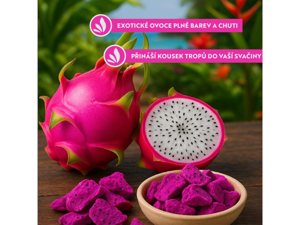Lyofilizované dračí ovoce je lahodná a sladká svačinka. Dopřejte si kousek jen tak, na chuť, či na doplnění energie, rozhodně nezůstanete u jednoho. Výrobek obsahuje přirozeně sa vyskytujíci sa cukry.