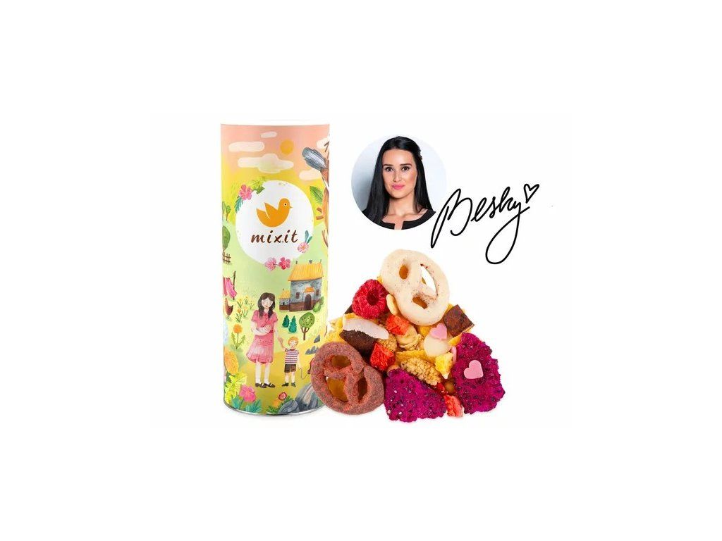 Limitovaná symfonie chutí od vítězky soutěže MasterChef Veroniky "Besky" Beskydiarové je poctou všem maminkám. Poděkujte jim za jejich lásku Mixem pro maminku, který je plný ovoce, oříšků a čokolády, která obalí i nervy. :-) Uvnitř tubusu z limitované edice s ilustrací od české výtvarnice se ukrývá lahodná kombinace preclíků s guaranou a jahodovým prachem, preclíků v bílé čokoládě s vanilkou, corn flakes v bílé čokoládě a růžových čokoládových srdíček, která vaše city řeknou za vás. Nechybí ani pořádná dávka vitamínů - jahody, moruše, maliny, dragon fruit, pomeranč a kokosové chipsy v natural i kakaové verzi. Správné tuky zase doplňují plátky mandlí. S tímhle mixem uděláte radost zaručeně a to nejen maminkám.